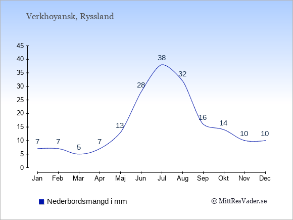 För att se hur vädret i Verkhoyansk skiljer sig från vädret hemma, kan du också jämföra siffrorna måned för måned med motsvarande siffror för Sverige under samma period här: Verkhoyansks klimat.
