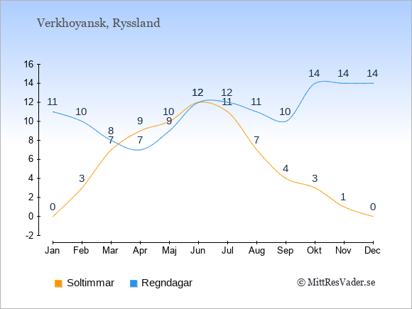 Grafen visar det genomsnittliga antalet soltimmar i Verkhoyansk under en viss månad (soltimmar är det antalet timmar per dag där solen skinnar), och antalet regndagar (dvs. det genomsnittliga antalet dagar
