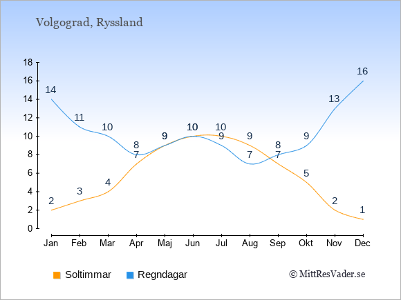 Grafen visar det genomsnittliga antalet soltimmar i Volgograd under en viss månad (soltimmar är det antalet timmar per dag där solen skinnar), och antalet regndagar (dvs. det genomsnittliga antalet dagar