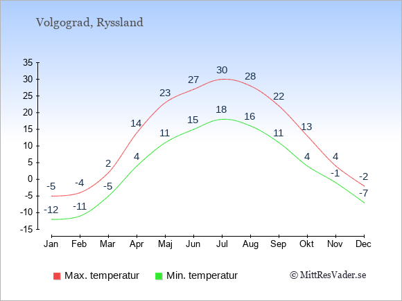Grafen visar de genomsnittligt högsta temperaturerna i Volgograd (vanligtvis det värde som uppmätts mitt på dagen) och de genomsnittligt lägsta temperaturer (vanligtvis tidpunkten just innan soluppgång).
