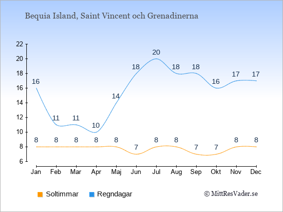 Grafen visar det genomsnittliga antalet soltimmar i Bequia Island under en viss månad (soltimmar är det antalet timmar per dag där solen skinnar), och antalet regndagar (dvs. det genomsnittliga antalet dagar