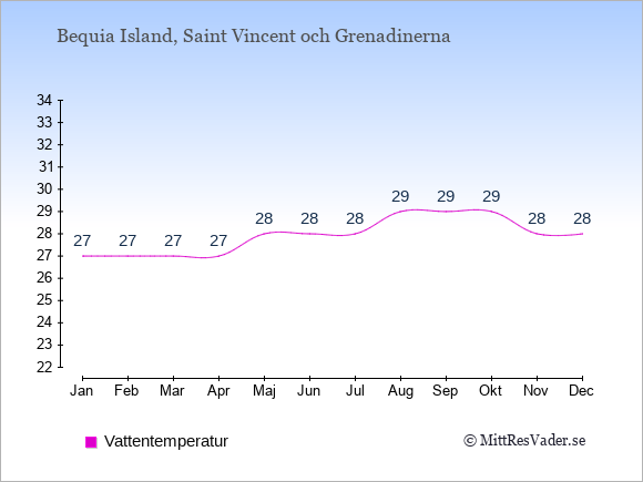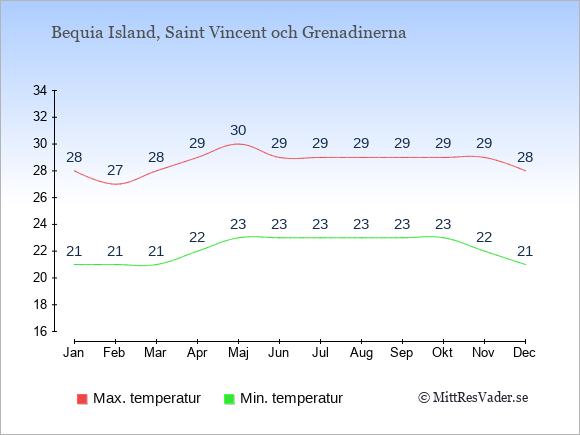 Grafen visar de genomsnittligt högsta temperaturerna i Bequia Island (vanligtvis det värde som uppmätts mitt på dagen) och de genomsnittligt lägsta temperaturer (vanligtvis tidpunkten just innan soluppgång).