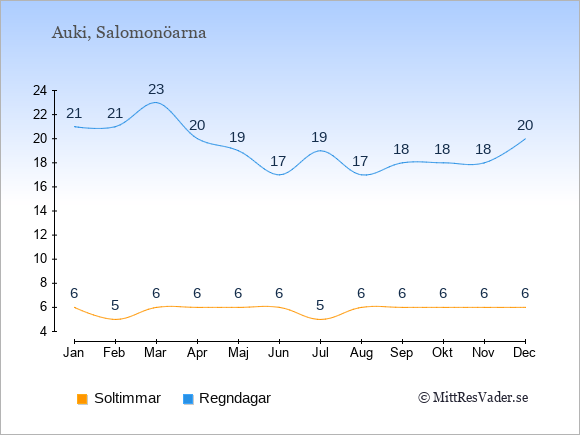 Grafen visar det genomsnittliga antalet soltimmar i Auki under en viss månad (soltimmar är det antalet timmar per dag där solen skinnar), och antalet regndagar (dvs. det genomsnittliga antalet dagar