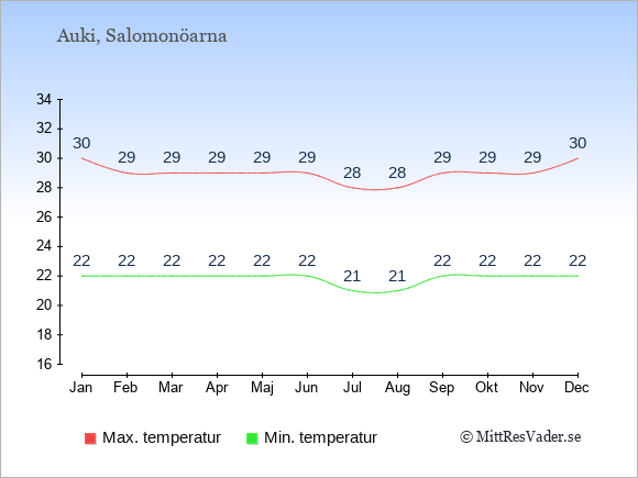 Grafen visar de genomsnittligt högsta temperaturerna i Auki (vanligtvis det värde som uppmätts mitt på dagen) och de genomsnittligt lägsta temperaturer (vanligtvis tidpunkten just innan soluppgång).