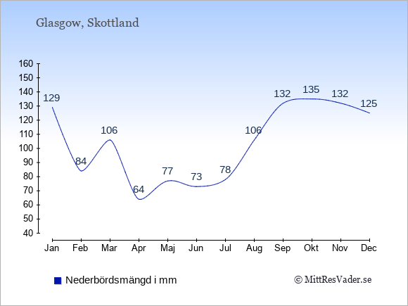 För att se hur vädret i Glasgow skiljer sig från vädret hemma, kan du också jämföra siffrorna måned för måned med motsvarande siffror för Sverige under samma period här: Glasgows klimat.