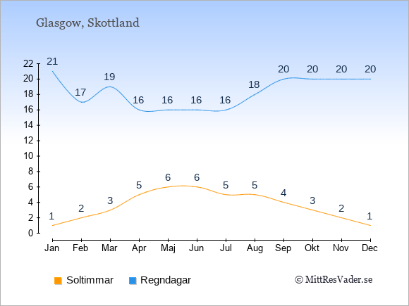 Vädret i Glasgow är oftast bäst i de månader där det finns många soltimmar och få dagars nederbörd.