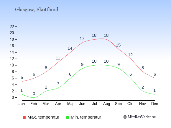 Grafen visar de genomsnittligt högsta temperaturerna i Glasgow (vanligtvis det värde som uppmätts mitt på dagen) och de genomsnittligt lägsta temperaturer (vanligtvis tidpunkten just innan soluppgång).