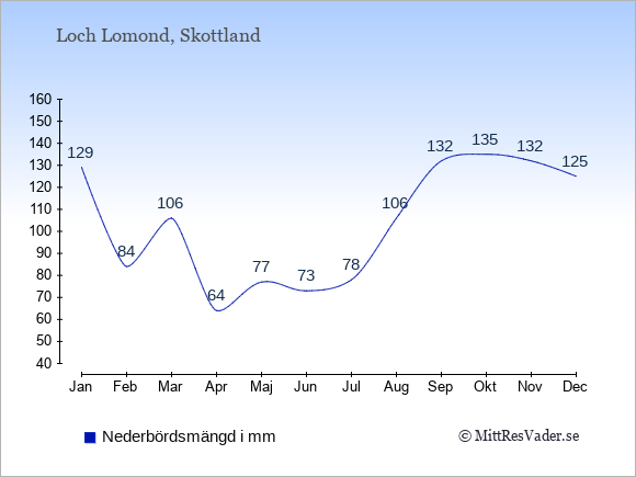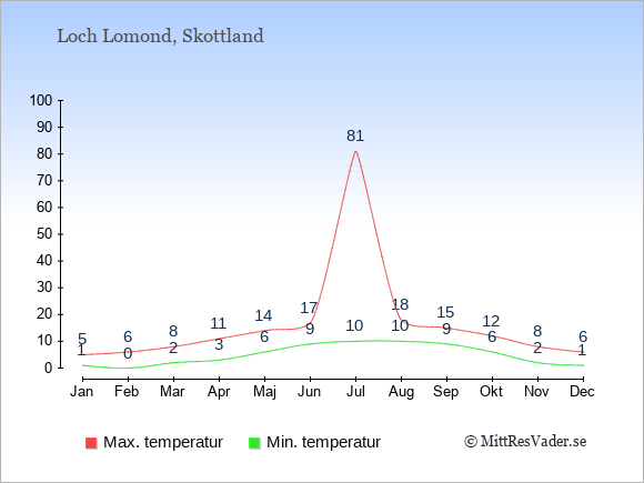 För att se hur vädret vid Loch Lomond skiljer sig från vädret hemma, kan du också jämföra siffrorna måned för måned med motsvarande siffror för Sverige under samma period här: Loch Lomonds klimat.