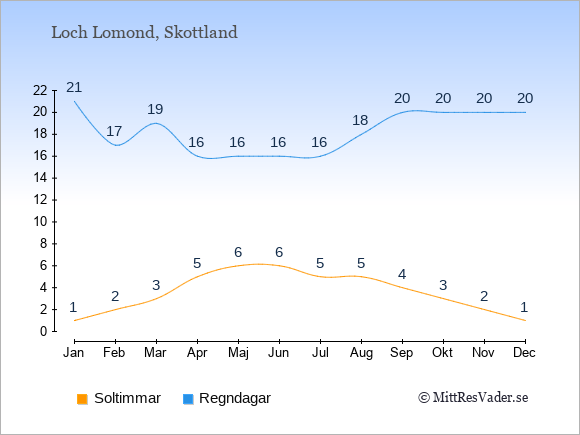 Grafen visar det genomsnittliga antalet soltimmar vid Loch Lomond under en viss månad (soltimmar är det antalet timmar per dag där solen skinnar), och antalet regndagar (dvs. det genomsnittliga antalet dagar