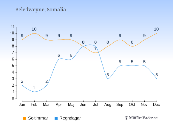 Grafen visar det genomsnittliga antalet soltimmar i Beledweyne under en viss månad (soltimmar är det antalet timmar per dag där solen skinnar), och antalet regndagar (dvs. det genomsnittliga antalet dagar