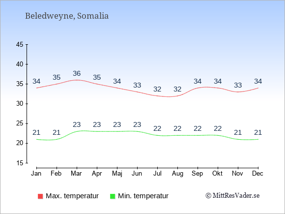 Grafen visar de genomsnittligt högsta temperaturerna i Beledweyne (vanligtvis det värde som uppmätts mitt på dagen) och de genomsnittligt lägsta temperaturer (vanligtvis tidpunkten just innan soluppgång).