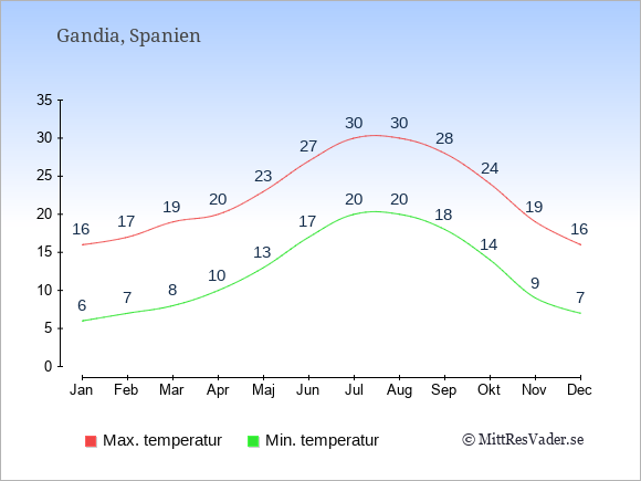 På denna sida kan du få en överblick över de statistiska klimatuppgifterna för Gandia månad för månad jämfört med klimatet i Stockholm. Information om det historiska klimatet kan du använda för att planera din semester och hitta den bästa tiden att resa till Gandia på.