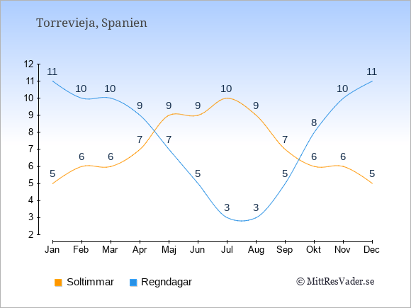 Graferna visar det genomsnittliga antalet soltimmar i Torrevieja per dag