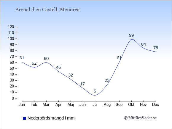 För att se hur vädret i Arenal d'en Castell skiljer sig från vädret hemma, kan du också jämföra siffrorna måned för måned med motsvarande siffror för Sverige under samma period här: Arenal d'en Castells klimat.