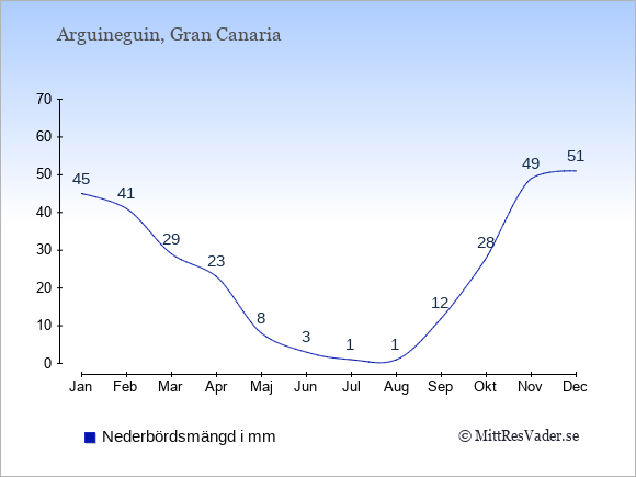 För att se hur vädret i Arguineguin skiljer sig från vädret hemma, kan du också jämföra siffrorna måned för måned med motsvarande siffror för Sverige under samma period här: Arguineguins klimat.