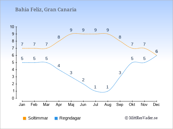 Grafen visar det genomsnittliga antalet soltimmar i Bahia Feliz under en viss månad (soltimmar är det antalet timmar per dag där solen skinnar), och antalet regndagar (dvs. det genomsnittliga antalet dagar