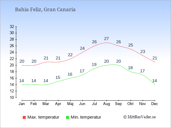 Grafen visar de genomsnittligt högsta temperaturerna i Bahia Feliz (vanligtvis det värde som uppmätts mitt på dagen) och de genomsnittligt lägsta temperaturer (vanligtvis tidpunkten just innan soluppgång).