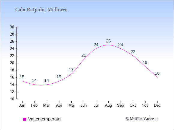 Grafen visar de genomsnittligt högsta temperaturerna i Cala Ratjada (vanligtvis det värde som uppmätts mitt på dagen) och de genomsnittligt lägsta temperaturer (vanligtvis tidpunkten just innan soluppgång).