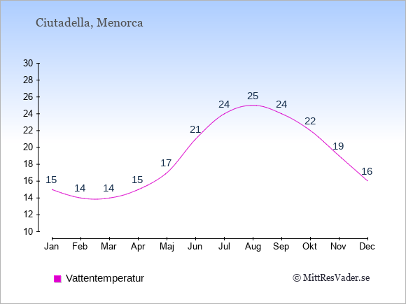 Grafen visar de genomsnittligt högsta temperaturerna i Ciutadella (vanligtvis det värde som uppmätts mitt på dagen) och de genomsnittligt lägsta temperaturer (vanligtvis tidpunkten just innan soluppgång).