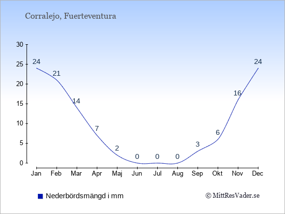 För att se hur vädret i Corralejo skiljer sig från vädret hemma, kan du också jämföra siffrorna måned för måned med motsvarande siffror för Sverige under samma period här: Corralejos klimat.