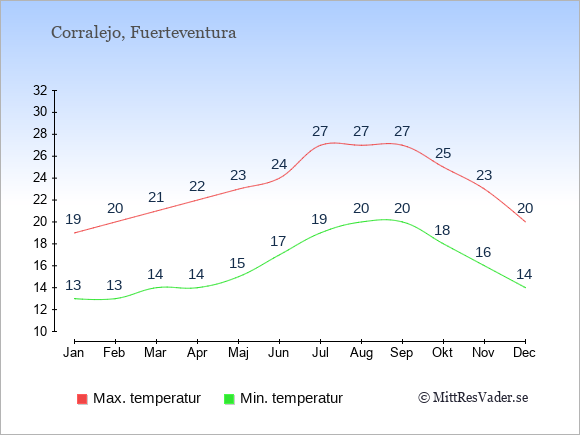 Grafen visar de genomsnittligt högsta temperaturerna i Corralejo (vanligtvis det värde som uppmätts mitt på dagen) och de genomsnittligt lägsta temperaturer (vanligtvis tidpunkten just innan soluppgång).