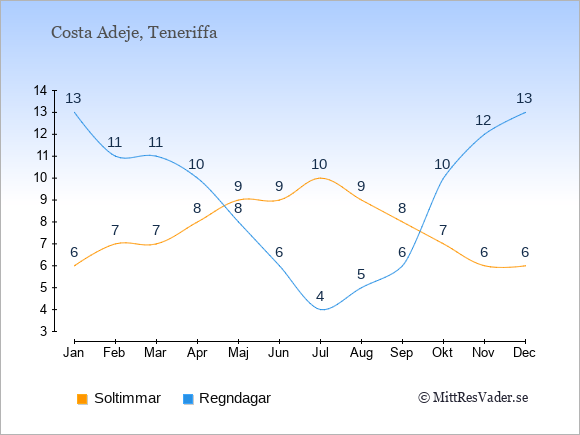 Grafen visar det genomsnittliga antalet soltimmar i Costa Adeje under en viss månad (soltimmar är det antalet timmar per dag där solen skinnar), och antalet regndagar (dvs. det genomsnittliga antalet dagar