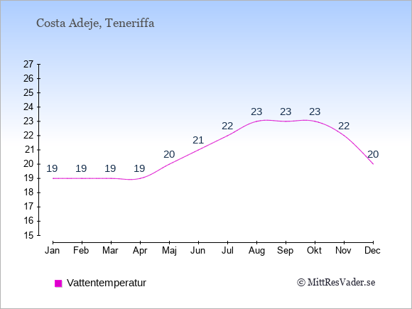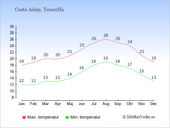 Grafen visar de genomsnittligt högsta temperaturerna i Costa Adeje (vanligtvis det värde som uppmätts mitt på dagen) och de genomsnittligt lägsta temperaturer (vanligtvis tidpunkten just innan soluppgång).