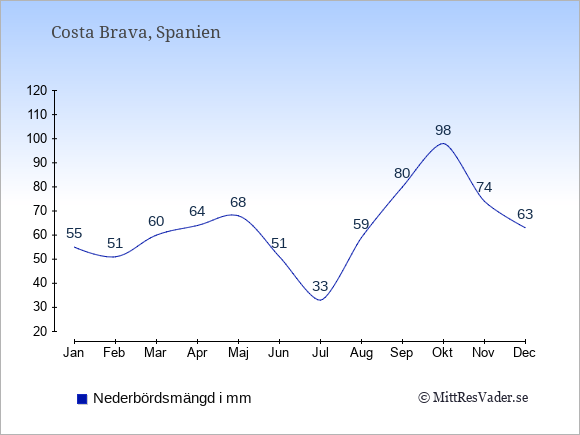 Vädret i Costa Brava är oftast bäst i de månader där det finns många soltimmar och få dagars nederbörd.