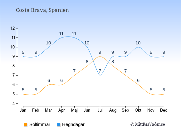 Grafen visar det genomsnittliga antalet soltimmar i Costa Brava under en viss månad (soltimmar är det antalet timmar per dag där solen skinnar), och antalet regndagar (dvs. det genomsnittliga antalet dagar