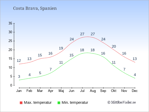 Grafen visar de genomsnittligt högsta temperaturerna i Costa Brava (vanligtvis det värde som uppmätts mitt på dagen) och de genomsnittligt lägsta temperaturer (vanligtvis tidpunkten just innan soluppgång).