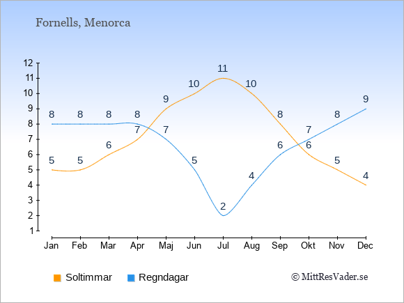 Grafen visar det genomsnittliga antalet soltimmar i Fornells under en viss månad (soltimmar är det antalet timmar per dag där solen skinnar), och antalet regndagar (dvs. det genomsnittliga antalet dagar