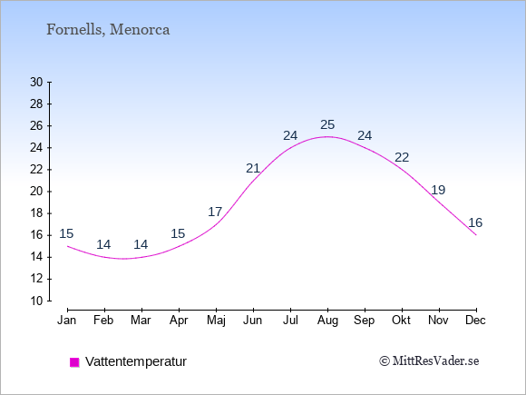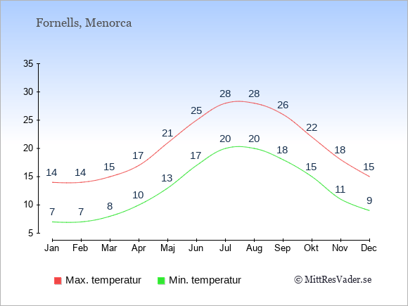 Grafen visar de genomsnittligt högsta temperaturerna i Fornells (vanligtvis det värde som uppmätts mitt på dagen) och de genomsnittligt lägsta temperaturer (vanligtvis tidpunkten just innan soluppgång).