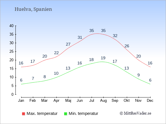 Grafen visar de genomsnittligt högsta temperaturerna i Huelva (vanligtvis det värde som uppmätts mitt på dagen) och de genomsnittligt lägsta temperaturer (vanligtvis tidpunkten just innan soluppgång).