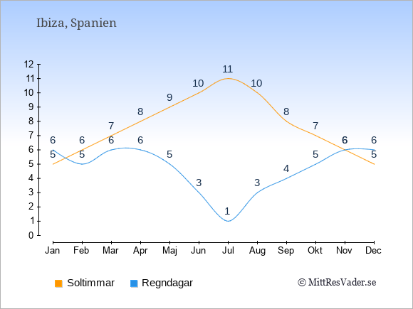 Grafen visar det genomsnittliga antalet soltimmar på Ibiza under en viss månad (soltimmar är det antalet timmar per dag där solen skinnar), och antalet regndagar (dvs. det genomsnittliga antalet dagar