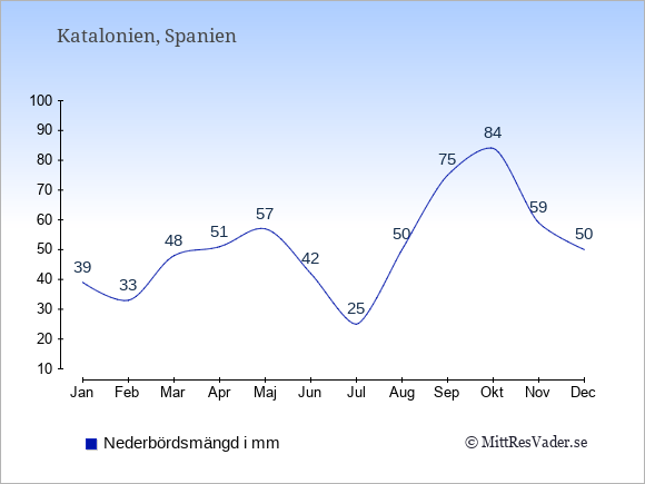 För att se hur vädret i Katalonien skiljer sig från vädret hemma, kan du också jämföra siffrorna måned för måned med motsvarande siffror för Sverige under samma period här: Kataloniens klimat.
