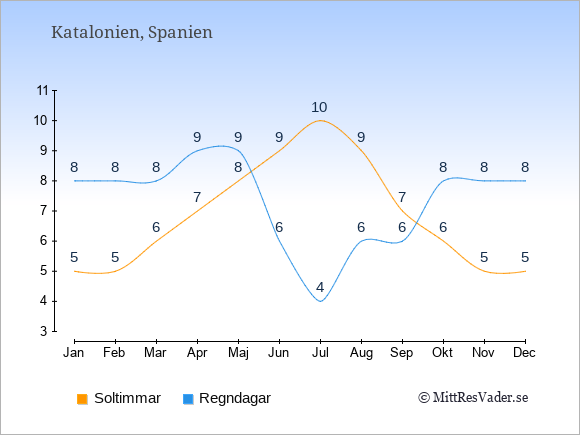 Grafen visar det genomsnittliga antalet soltimmar i Katalonien under en viss månad (soltimmar är det antalet timmar per dag där solen skinnar), och antalet regndagar (dvs. det genomsnittliga antalet dagar