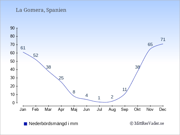 För att se hur vädret på La Gomera skiljer sig från vädret hemma, kan du också jämföra siffrorna måned för måned med motsvarande siffror för Sverige under samma period här: La Gomeras klimat.