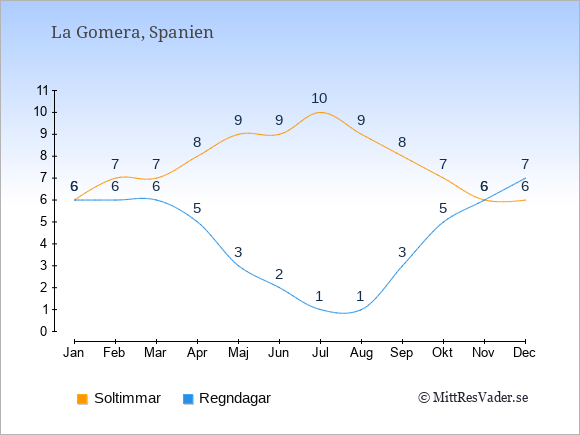 Grafen visar det genomsnittliga antalet soltimmar på La Gomera under en viss månad (soltimmar är det antalet timmar per dag där solen skinnar), och antalet regndagar (dvs. det genomsnittliga antalet dagar