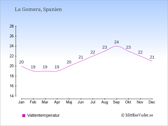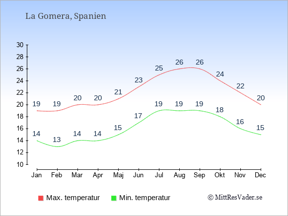 Grafen visar de genomsnittligt högsta temperaturerna på La Gomera (vanligtvis det värde som uppmätts mitt på dagen) och de genomsnittligt lägsta temperaturer (vanligtvis tidpunkten just innan soluppgång).