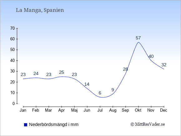 Vädret i La Manga är oftast bäst i de månader där det finns många soltimmar och få dagars nederbörd.