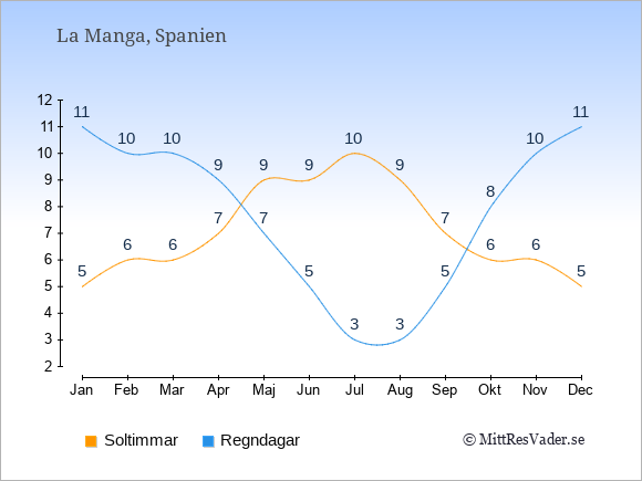 Grafen visar det genomsnittliga antalet soltimmar i La Manga under en viss månad (soltimmar är det antalet timmar per dag där solen skinnar), och antalet regndagar (dvs. det genomsnittliga antalet dagar