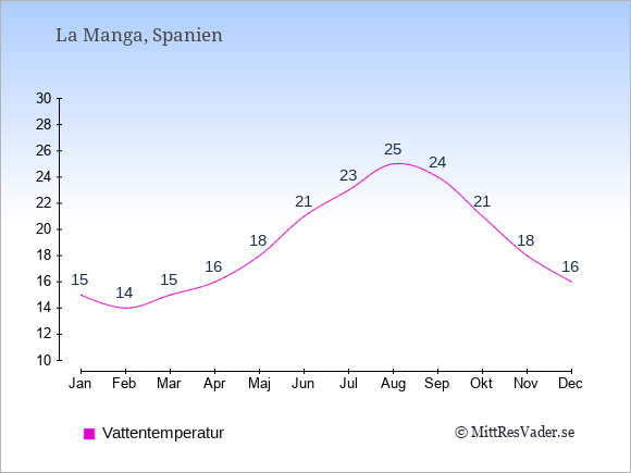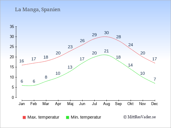 Grafen visar de genomsnittligt högsta temperaturerna i La Manga (vanligtvis det värde som uppmätts mitt på dagen) och de genomsnittligt lägsta temperaturer (vanligtvis tidpunkten just innan soluppgång).