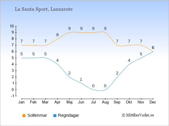 Grafen visar det genomsnittliga antalet soltimmar i La Santa Sport under en viss månad (soltimmar är det antalet timmar per dag där solen skinnar), och antalet regndagar (dvs. det genomsnittliga antalet dagar