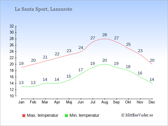 Grafen visar de genomsnittligt högsta temperaturerna i La Santa Sport (vanligtvis det värde som uppmätts mitt på dagen) och de genomsnittligt lägsta temperaturer (vanligtvis tidpunkten just innan soluppgång).