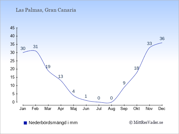För att se hur vädret i Las Palmas skiljer sig från vädret hemma, kan du också jämföra siffrorna måned för måned med motsvarande siffror för Sverige under samma period här: Las Palmas klimat.