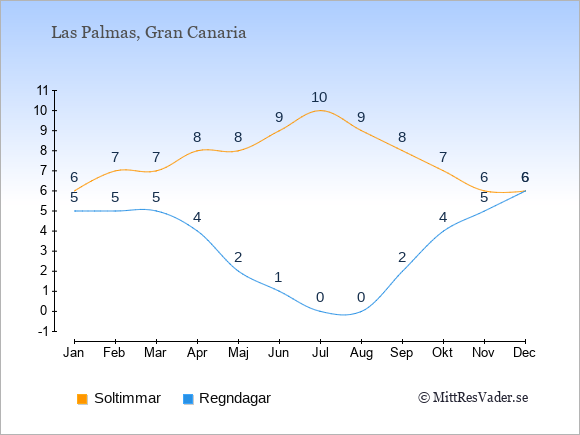 Grafen visar det genomsnittliga antalet soltimmar i Las Palmas under en viss månad (soltimmar är det antalet timmar per dag där solen skinnar), och antalet regndagar (dvs. det genomsnittliga antalet dagar