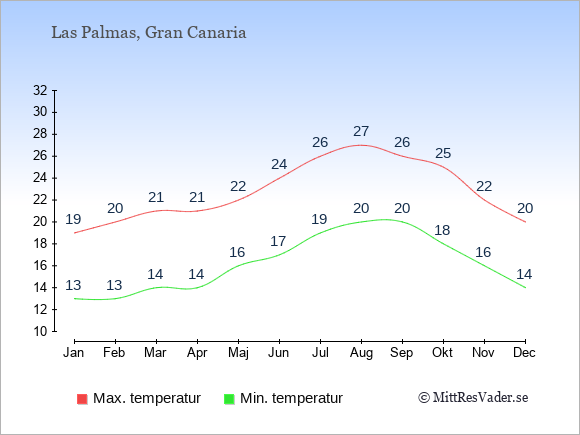 Grafen visar de genomsnittligt högsta temperaturerna i Las Palmas (vanligtvis det värde som uppmätts mitt på dagen) och de genomsnittligt lägsta temperaturer (vanligtvis tidpunkten just innan soluppgång).