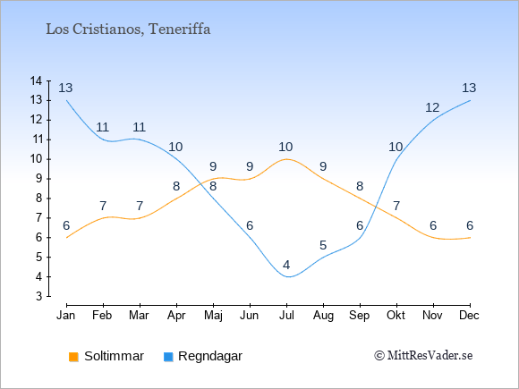 Grafen visar det genomsnittliga antalet soltimmar i Los Cristianos under en viss månad (soltimmar är det antalet timmar per dag där solen skinnar), och antalet regndagar (dvs. det genomsnittliga antalet dagar