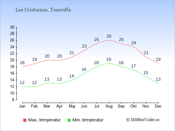 Grafen visar de genomsnittligt högsta temperaturerna i Los Cristianos (vanligtvis det värde som uppmätts mitt på dagen) och de genomsnittligt lägsta temperaturer (vanligtvis tidpunkten just innan soluppgång).