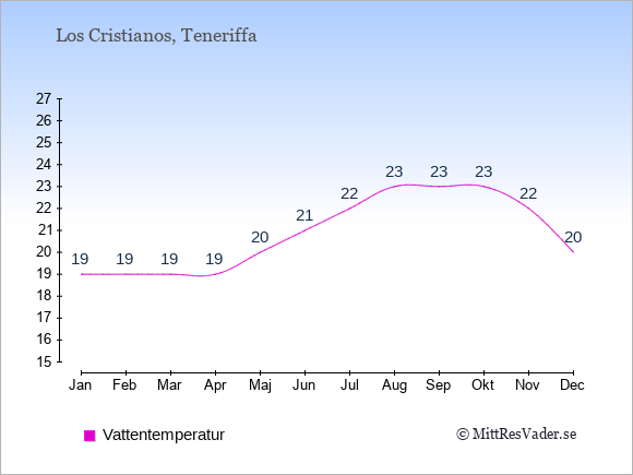 För att se hur vädret i Los Cristianos skiljer sig från vädret hemma, kan du också jämföra siffrorna måned för måned med motsvarande siffror för Sverige under samma period här: Los Cristianos klimat.